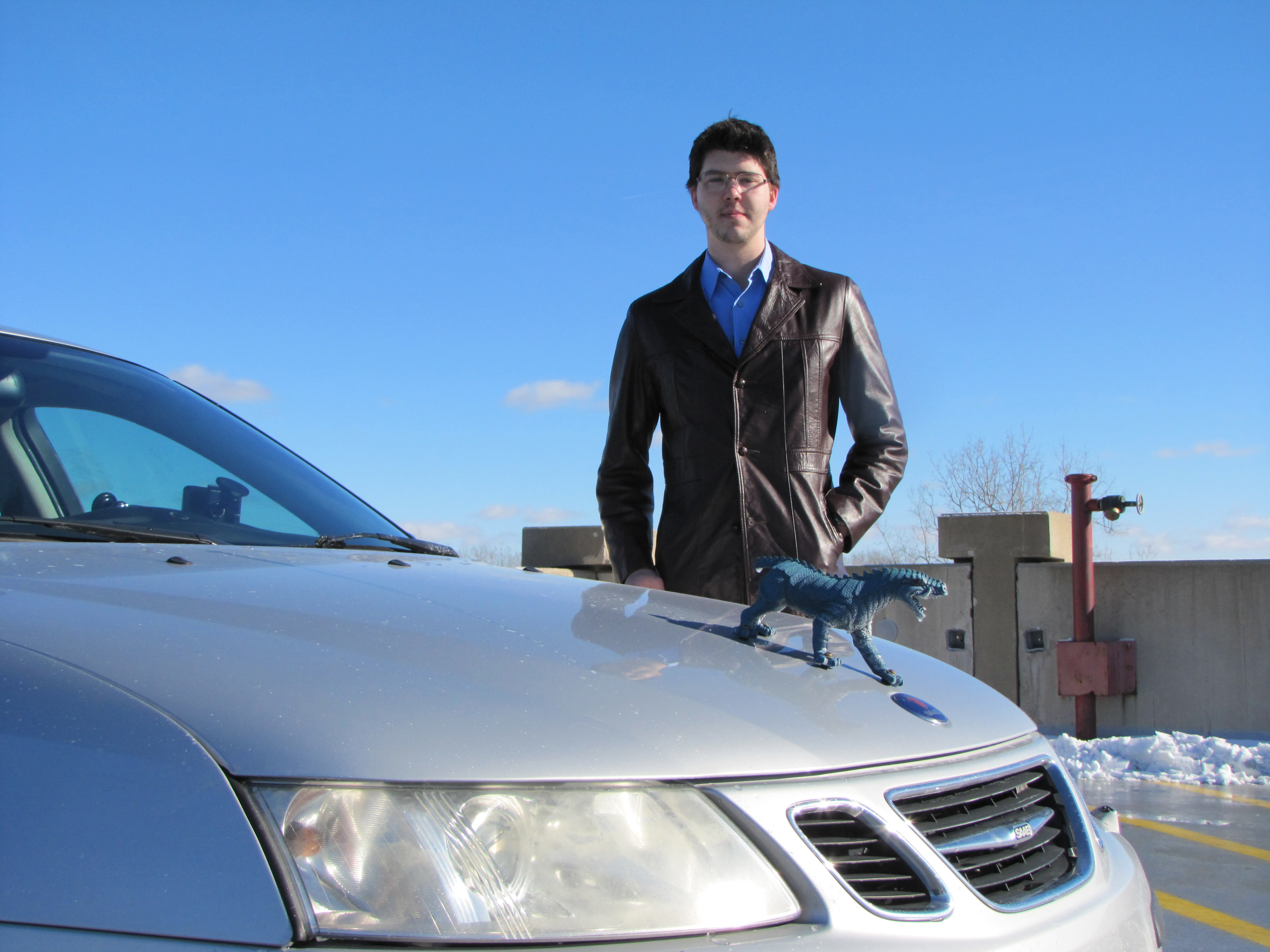 A dragon action figure sits on the hood of junior Caleb Balk’s 2004 Saab 9-3. The action figure was part of a collection he and his brothers had as children. This is the third vehicle he has placed it on.