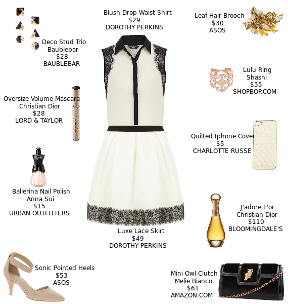 2. Keep it subtle: Sometimes, less is more. For a subtle take on the trend, choose an item with lacy trim. A cute white tank and matching skirt with black lace trim makes a sophisticated statement. Glam up with a sparkling hair pin, earrings, a gold cuff and pale pointed heels.