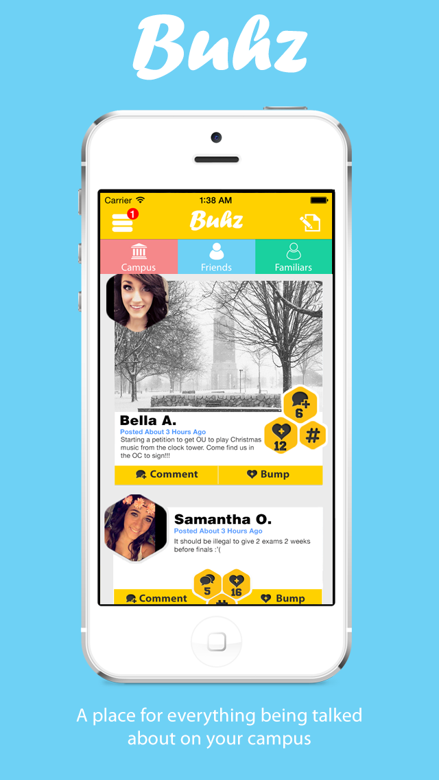 Described as “Twitter for college,” the idea for Buhz came to Kelly as a freshman — he wanted an easier way to know about social things on campus, so he could get involved while still focusing on school. From there the idea grew from a concept into a full application.